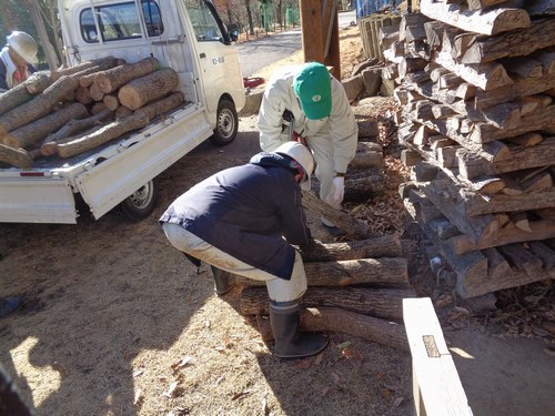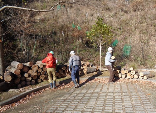 先週で「クヌギ(椚、櫟)」の伐採を終え、今日は、切りそろえた窯木を炭窯の前まで運ぶ作業が中心。台場クヌギの再生林に残っていた太枝を窯木に切りそろえる作業も併行して行う。